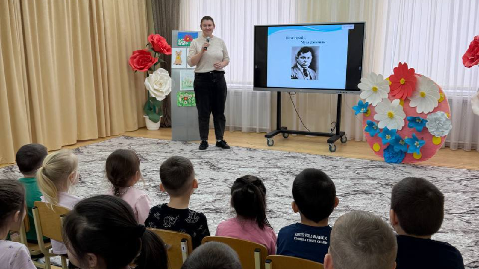 Сегодня в МБДОУ- Тюлячинский детский сад №3 прошло мероприятие, посвященное 120-летию со дня рождения советского татарского поэта и Героя Советского союза Мусы Джалиля. Цель мероприятия- воспитывать чувство национальной гордости за своего земляка, свою Родину. На мероприятии музыкальный руководитель Нуртдинова Р.С. ознакомила детей с биографией и творчеством Мусы Джалиля. Дети пропели песни, сложенные на стихотворения Мусы Джалиля, а также поиграли в игры, в которые в детстве играл сам поэт, рассказывали его стихотворения.