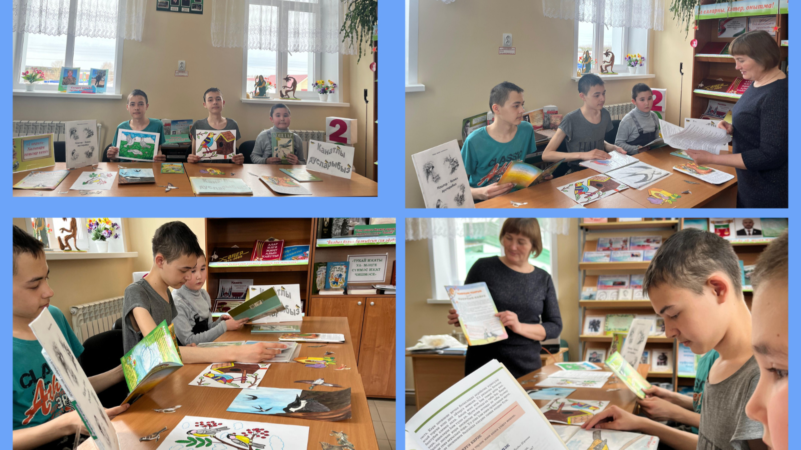 На оформленной книжной выставке «Канатлы дусларыбыз» дети узнали о некоторых представителях пернатой планеты, интересных фактах из жизни птиц и о том, как правильно подготовиться к прилёту крылатых друзей. Ребята познакомились с многообразием птиц, их жизнью, а также с той важной ролью, которую они играют в природе и жизни человека.