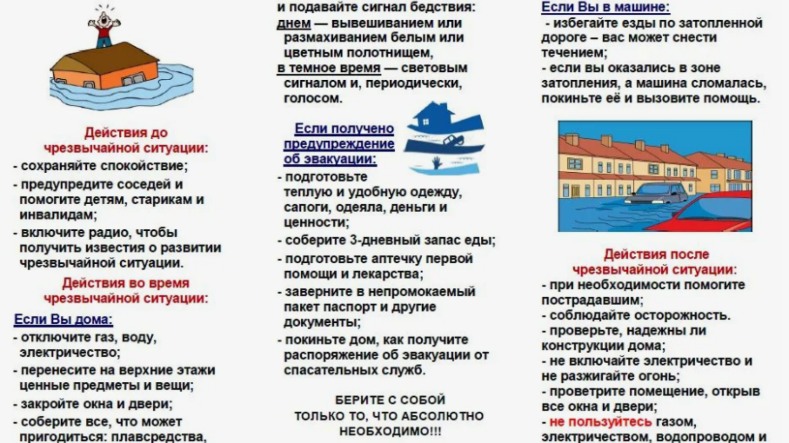 · Самоэвакуацию на незатопленную территорию производите только в крайних случаях: для оказания неотложной медицинской помощи пострадавшим, при отсутствии воды и продуктов питания (в случае длительного времени вынужденной изоляции) и только при помощи имеющихся подручных средств, позволяющих держаться на плаву;