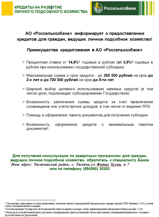 АО «Россельхозбанк» информирует о предоставлении кредитов для граждан, ведущих личное подсобное хозяйство!