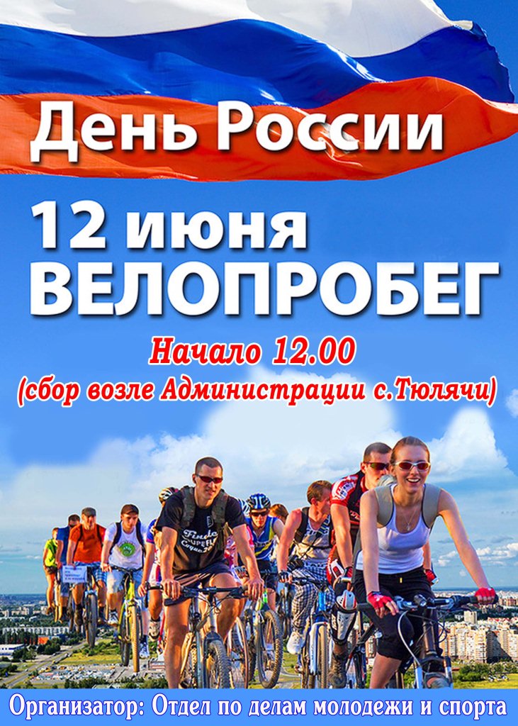 12 июня в Тюлячинском районе состоится велопробег, посвященный Дню России. Начало в 12.00 ч. Сбор у здания администрации. Возраст не ограничен. Велосипеды иметь при себе.