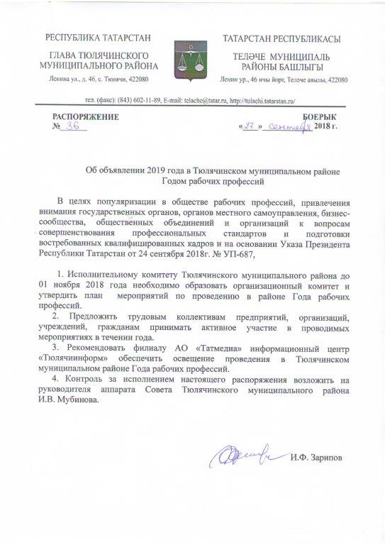 1. Исполнительному комитету Тюлячинского муниципального района до 01 ноября 2018 года необходимо образовать организационный комитет и утвердить план мероприятий по проведению в районе Года рабочих профессий.
