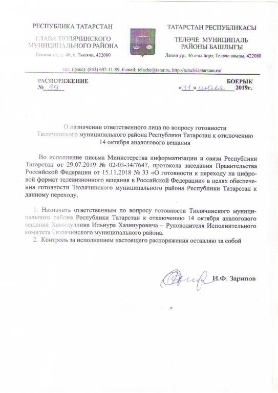 Распоряжение № 39 от 31.07.2019 г. О назначении ответственного лица по вопросу готовности Тюлячинского муниципального района Республики Татарстан к отключению 14 октября аналогового вещания