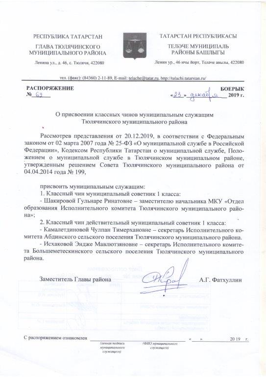 Рассмотрев представления от 20.12.2019, в соответствии с Федеральным законом от 02 марта 2007 года № 25-ФЗ «О муниципальной службе в Российской Федерации», Кодексом Республики Татарстан о муниципальной службе, Положением о муниципальной службе в Тюлячинском муниципальном районе, утвержденным решением Совета Тюлячинского муниципального района от