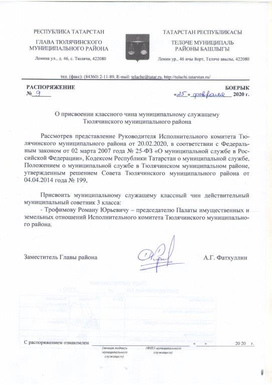 - Трофимову Роману Юрьевичу – председателю Палаты имущественных и земельных отношений Исполнительного комитета Тюлячинского муниципального района.