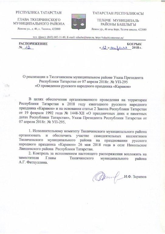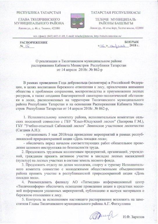 Распоряжение № 16 от 16.04.2018г. О реализации в ТМР распоряжения КМ РТ от 14.04.2018г. № 862-р