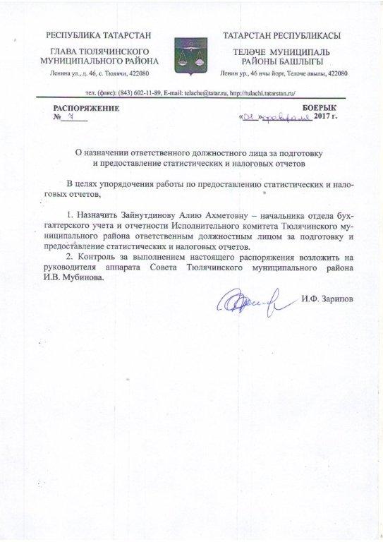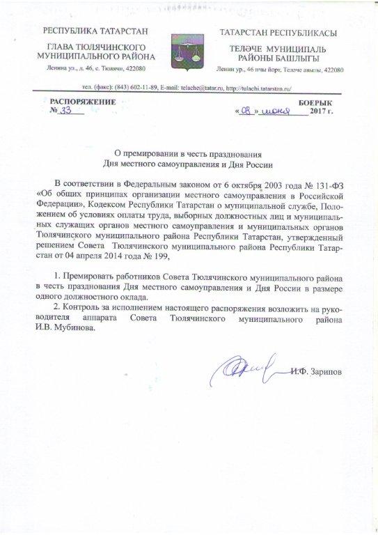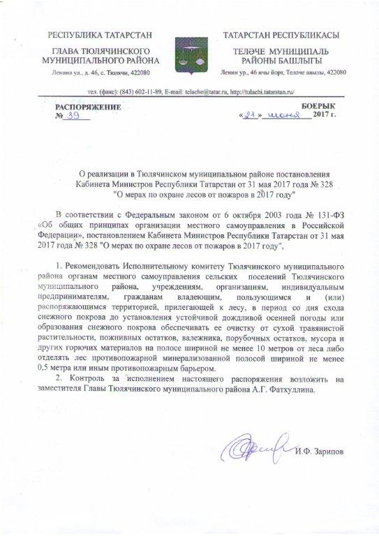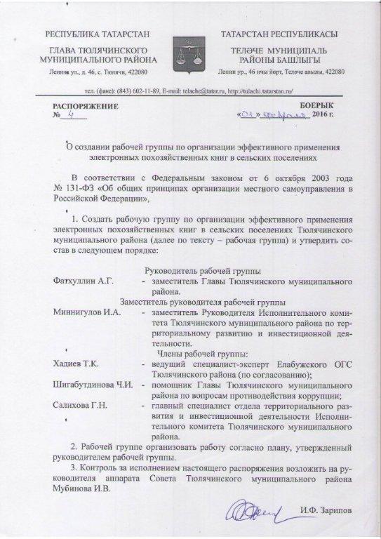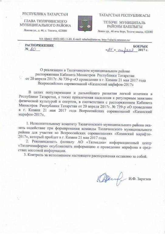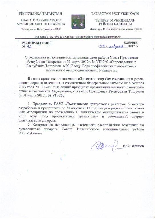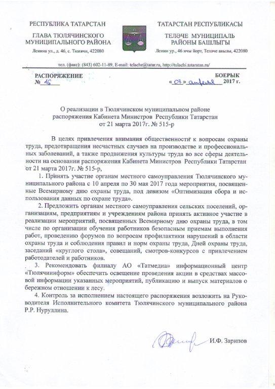 Распоряжение № 16 от 07.04.2017г. О реализации в ТМР распоряжения КМ РТ от 21.03.2017г. № 515-р