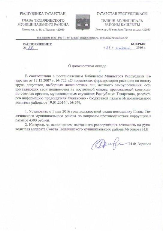 Распоряжение № 22 от 27.04.2016г. О должностном окладе