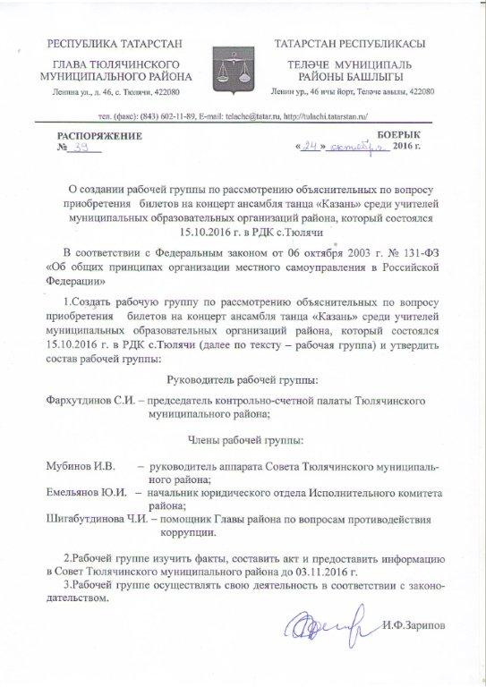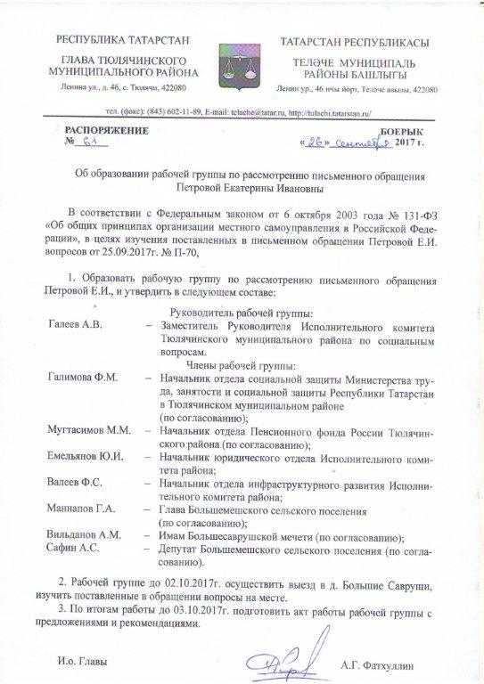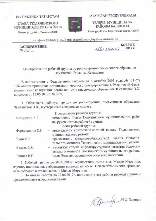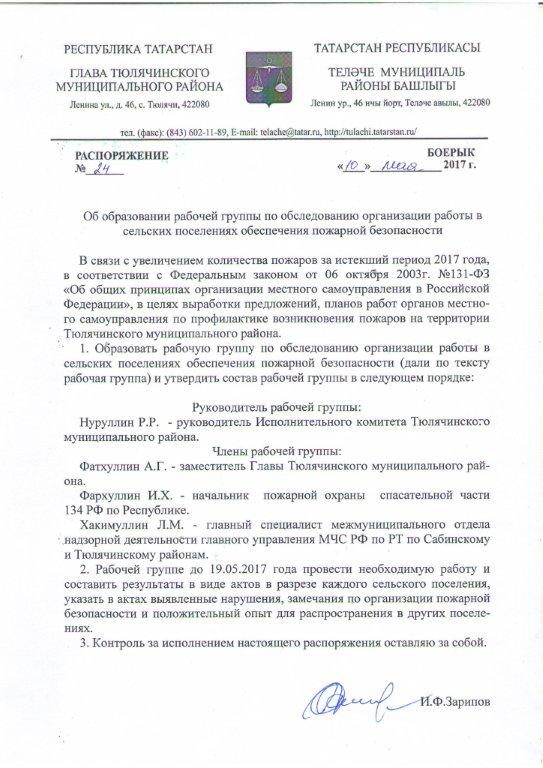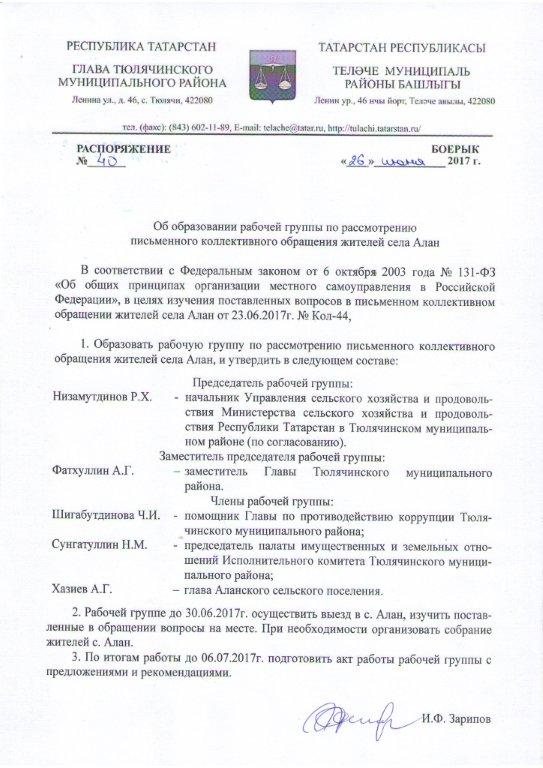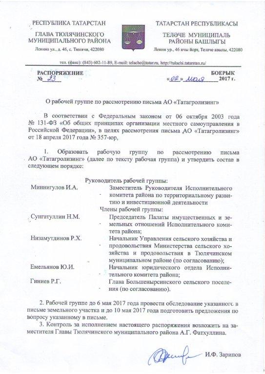 Распоряжение № 23 от 02.05.2017г. О рабочей группе по рассмотрению письма АО "Татагролизинг"