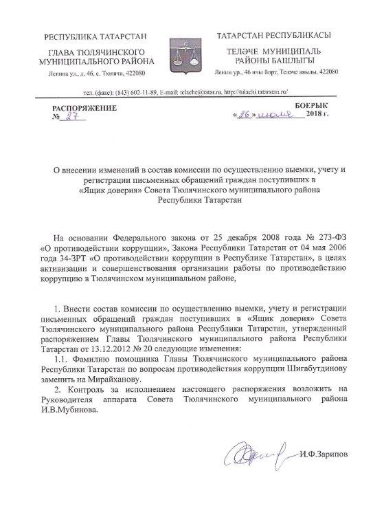 Распоряжение № 27 от 13.05.2017г. О реализации в ТМР распоряжения КМ РТ от 20.04.2017г. №735-р