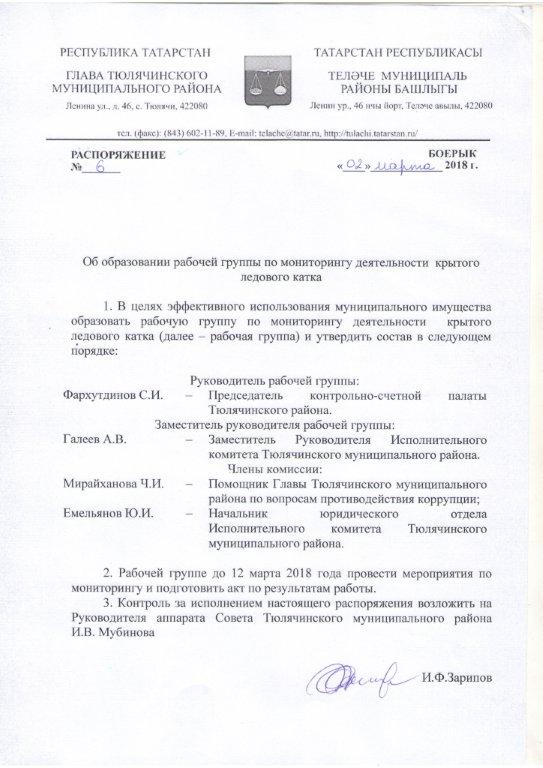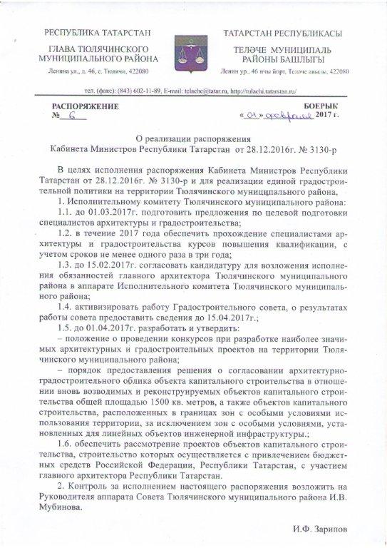 Распоряжение № 6 от 01.02.2.016г. О реализации распоряжения КМ РТ от 28.12.2016г. № 3130-р
