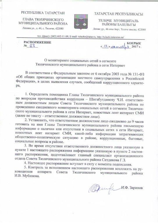 Распоряжение № 67 от 17.10.2017г. О мониторинге социальных сетей в сегменте ТМР в сети интернет