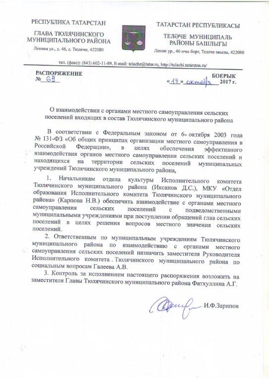 Распоряжение № 69 от 17.10.2017г. О взаимодействии с ОМС СП входящих в состав ТМР