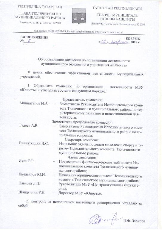Распоряжение № 7 от 02.03.2018г. Об образовании комиссии по организации деятельности МБУ Юность