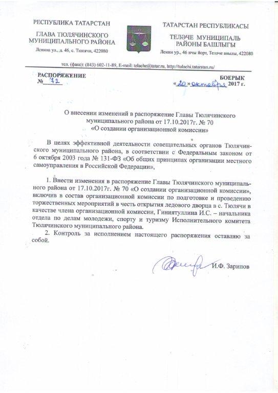 Распоряжение № 70 от 17.10.2017г. О создании организационного комитета (ледовый)