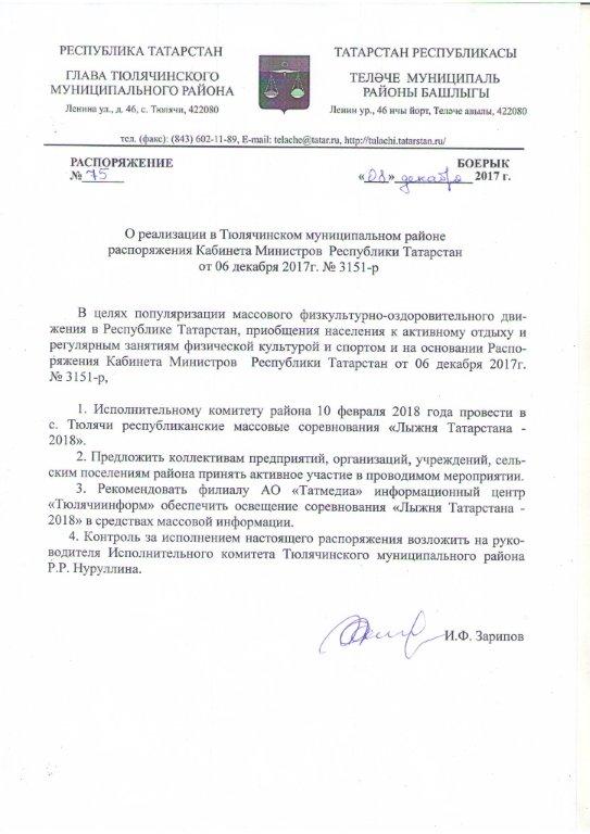 Распоряжение № 75 от 08.12.2017г. О реализации в ТМР распоряжения КМ РТ от 06.12.2017г. № 3151-р