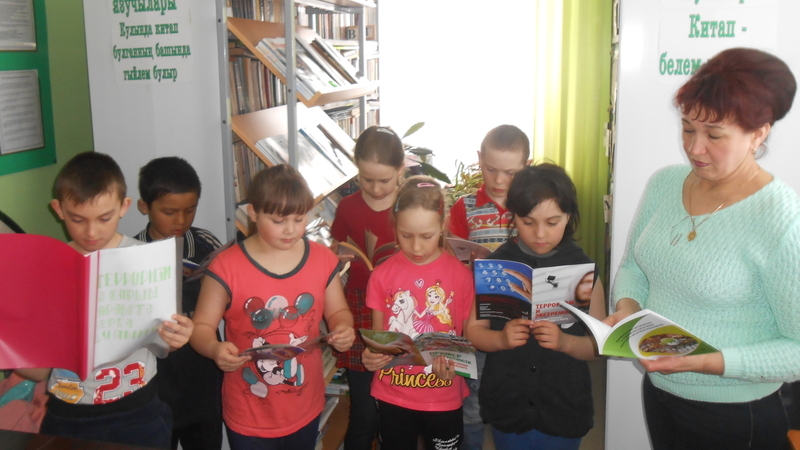 Китапханәче укучыларны терроризмга багышланган күргәзмә белән таныштырганнан соң, куркыныч янаган очракта үз-үзеңне саклау кагыйдәләре белән таныштырды.