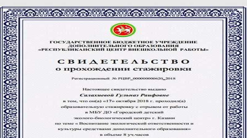 17 октябрь көнне Балалар иҗат үзәгенең өстәмә белем бирү педагогы Салахиева Гөлназ Раифовна “Өстәмә белем бирү өлкәсендә экологик тәрбия бирү” темасына оештырылган, белем бирү стажировкасында катнашты. Гөлназ Раифовнага катнашу турында таныклык тапшырылды.