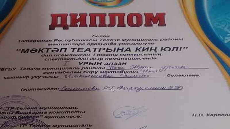 Алар Роза Хафизованың “Сак-сок тавышы” әсәрен сәхнәләштерделәр. Ә 11 сыйныф укучысы Имамиева Гөлинә “Спектакльдән җыр номинациясе”ндә 1 урын урын яулады. Барлык укучыларга да иҗади уңышлар, яңа җиңүләр телибез!