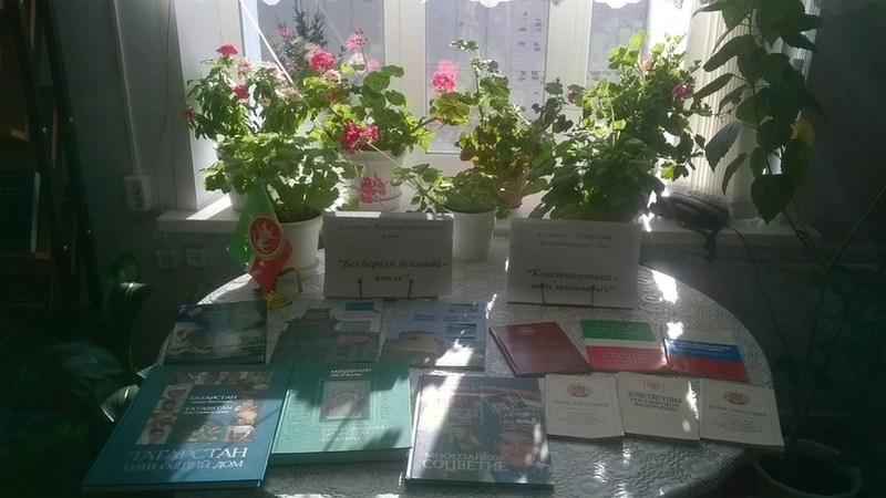 Күргәзмәгә “Татары”, “Татарстан-минем Ватаным”, “Татарстан уртак йортыбыз”, “Татарстан Республикасы Конституциясе”, “Без тарихта эзлебез” дигән китаплар урнаштырылды.