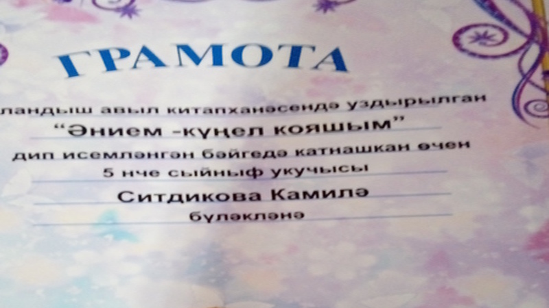Анда 2-5 сыйныф укучылары катнашты.Үз иншаларында балалар үзләре өчен иң кадерле кеше булган – әниләрен ничек яратуларын чагылдырдылар. Иншалар бәйгесендә Чулпан Мөбәрәкшина (5 сыйныф) һәм Камилә Ситдыйкова (5 сыйныф) җиңүче булдылар.