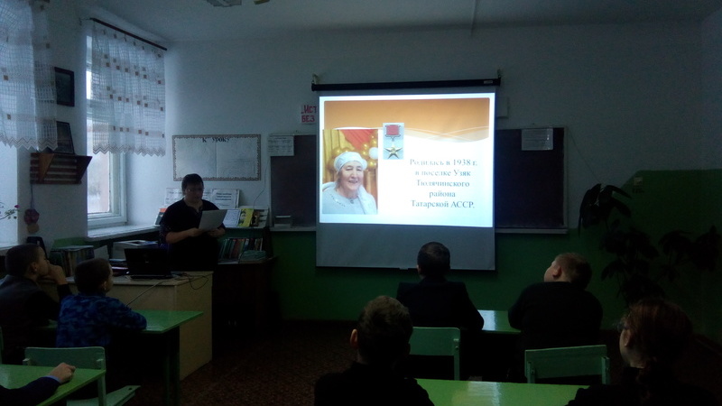 Балалар өчен Социалистик Хезмәт Герое Кәримова Гөлбикә Гали кызы турында презентация күрсәтелде, аның тормыш юлы һәм хезмәт уңышлары турында сөйләделәр.