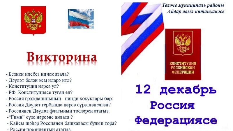 Шул вакыттан бирле иң әһәмиятле дәүләт бәйрәмнәренең берсе-Конституция көне. Конституция дәүләтнең төп законы – илнең барлык хокукый системасының нигезе булып тора, башка законнарның мәгънәсен һәм эчтәлеген билгели. Айдар авыл китапханәсендә, Конституция көне уңаеннан, укучылар өчен "12 декабрь - Россия Федерацисе конституциясе көне" дигән белешмәлек эшләнде.