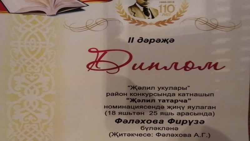 Бәйге нәфис сүз сәнгатенә кызыксыну уяту, шигъри сүзнең матурлыгын һәм сәнгатьлелеген тоя белү сәләтен үстерү максатыннан үткәрелде. «Татар телендә уку» номинациясенең 18 яшьтән 25 яшькә кадәр булган яшь төркемнәре арасында катнашып, Фирүзә Фаляхова 2 урынны яулады. Җитәкчесе- Айдар авылы китапханәчесе Алсу Фаляхова.