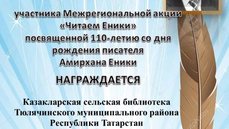 Казакларавылкитапханәсе татар халыкязучысыӘмирханЕникинеңтууына 110 ел тулугабагышланган #Еникиныукыйбыздиписемләнгәнтөбәкараакциягәкушылдыһәм диплом беләнбүләкләнде.