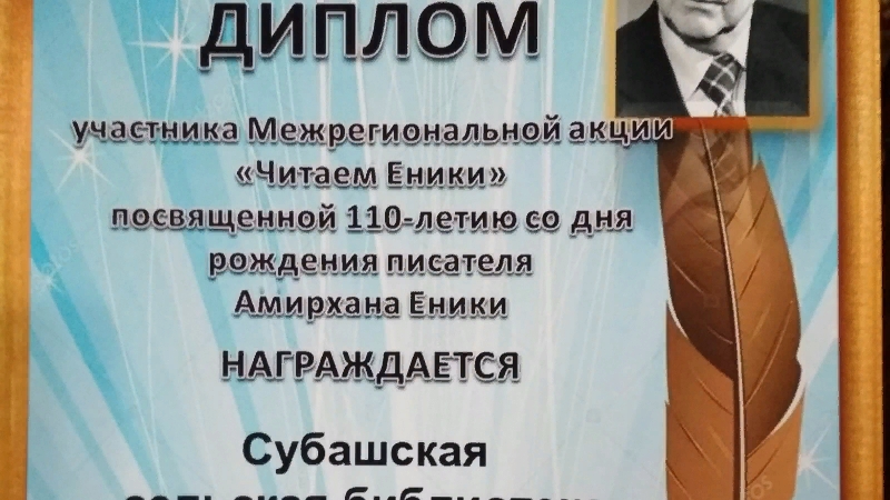 Субаш авыл китапханәсе татар халык язучысы Эмирхан Еникиның тууына 110 ел тулуга багышланган "Еникийны укыйбыз" дип исемләнгән тобәкара акциягә кушылды һәм диплом белән бүләкләнде.