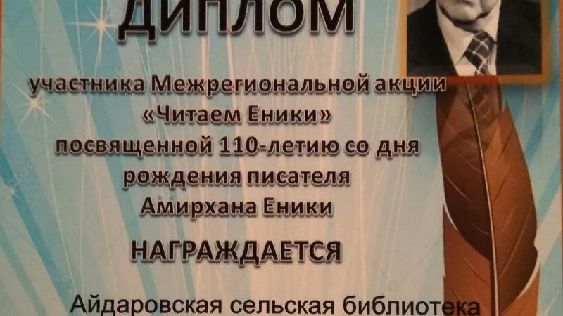Айдар авыл китапханәсе язучы Әмирхан Еникиның тууына 110 ел тулуга багышланган «Еникины укыйбыз» төбәкара акциясендә катнашып Диплом белән бүләкләнде.