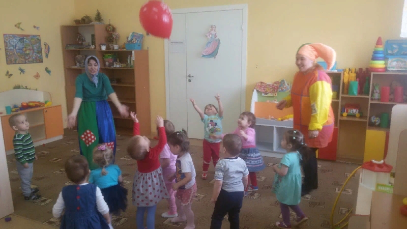 Балалар клоун белән гадәти булмаган иртәнге гимнастика ясадылар, өлкән төркем балалары белән тәрбиячеләр кызыклы уеннар үткәрделәр.