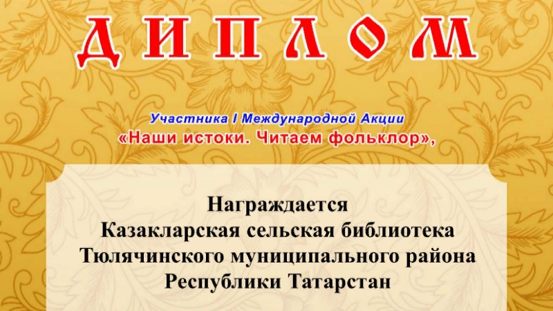 Казаклар авылы китапханәсе Ульяновск өлкәсе С.Т. Аксаков исемендәге балалар һәм яшүсмерләр китапханәсе оештырган “Безнең тамырлар. Фольклор укыйбыз" дигән төбәкара акциядә катнашты һәм диплом белән бүләкләнде.