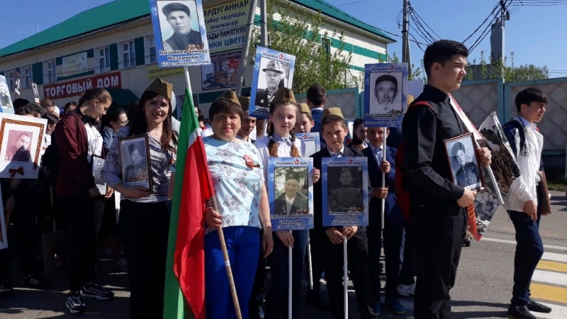 «Үлемсез полк» акциясе - 9 май бәйрәменә күркәм төс өстәүче традицияләренең берсенә әверелде. Бу көнне халык сугышта катнашкан, яу кырында ятып калган туганнарының истәлекле фотосурәтләре белән урамга чыкты. Әлеге акциядә Теләче район үзәгендә Баландыш төп мәктәбе укучылары да бик теләп катнаштылар.
