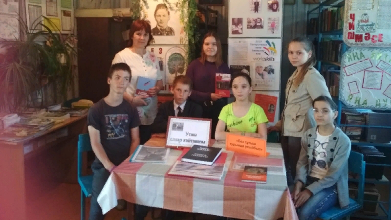 Укучылар белән сугыш темасына шигырьләр укылды һәм әңгәмә уздырылды. Күргәзмәдәге китапларга күзәтү ясалды.