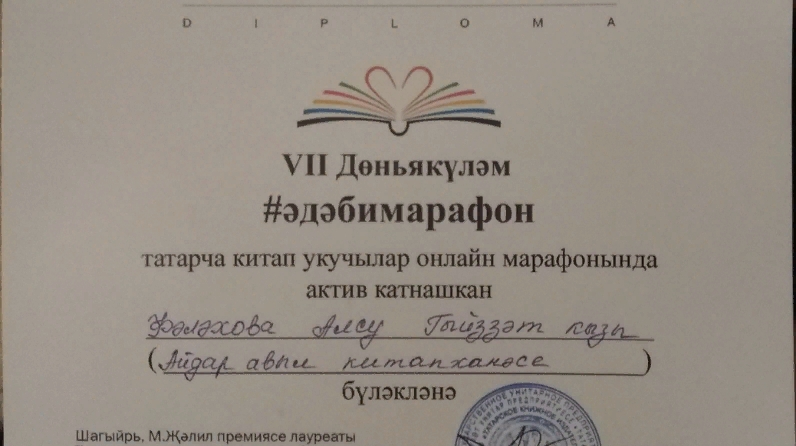 15 май көнне Айдар авыл китапханәчесе А.Фаляхова #әдәбимарафон дип аталган VII нче Бөтендөнья онлайн проектның финал өлешендә катнашып диплом белән бүләкләнде. Әлеге чара Казан шәһәренең УНИКС концертлар залында узды.