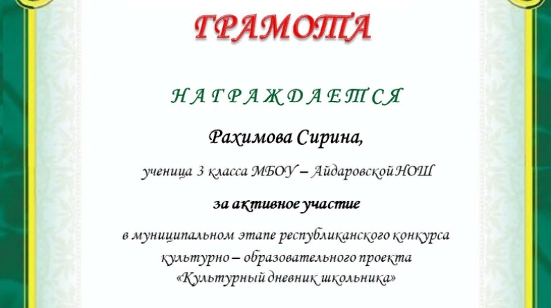 “Укучының мәдәни көндәлеге” – республиканың әһәмиятле мәдәни-белем бирү проекты. Ул Татарстан Мәдәният министрлыгы, Мәгариф һәм фән министрлыгы тарафыннан Татарстан Президенты Рөстәм Миңнеханов патронажы белән 2014 елдан бирле уздырыла. Айдар авылы китапханәсенең иң күп китап укучысы Сиринә Рәхимова, «Укучының мәдәни көндәлеге» проектында актив катнашканы өчен грамота белән бүләкләнде.
