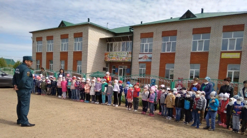 Балалар бакчасы эшләүчеләре һәм балалар янгынга каршы практик белемләрен күрсәттеләр. Һәр төркемнең икешәр хезмәткәре житәкчелегендә балалар, эвакуация планында билгеләнгән чыгу урынына, 5 минут эчендә чыгып җиттелэр.