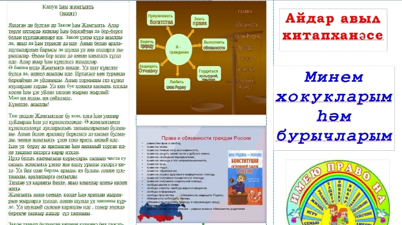 31 май көнне, Айдар авыл китапханәсендә "Минем хокукларым һәм бурычларым" исемле буклет төзелде. Буклетны файдаланып балалар әкиятләр аша хокук, бурыч сүзләренең мәгънәләренә төшенә алалар. Әлеге буклет укучылар һәм яшүсмерләр өчен файдалы булыр дип ышанабыз.