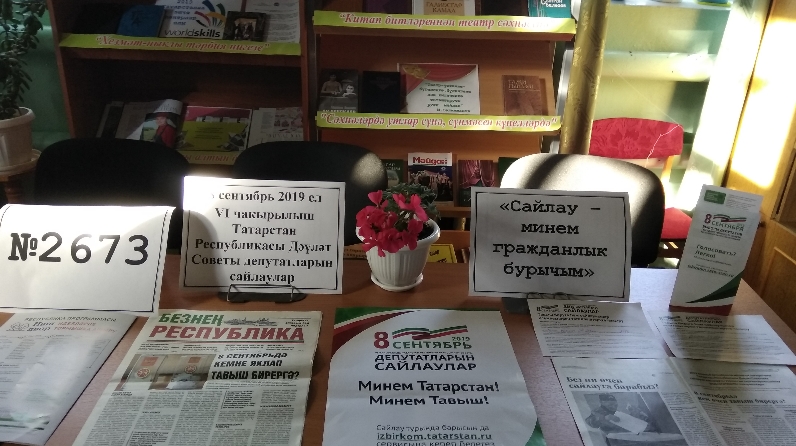4 сентябрь көнне Айдар авыл китапханәсендә 2019 елның 8 сентябрендә узачак алтынчы чакырылыш Татарстан Республикасы Дәүләт Советына депутатлар сайлау буенча «Сайлау-минем гражданлык бурычым» дип исемләнгән күргәзмә төзелде. 2019 елның сентябрендә булачак сайлаулар, һичшиксез, безнең республикада елның төп сәяси вакыйгасы булачак. Без, һичшиксез, илебезнең киләчәген формалаштыруга үз өлешебезне кертү өчен сайлауда катнашырга тиеш. Барлык сайлаучыларны да гражданлык бурычларын үтәргә чакырабыз.
