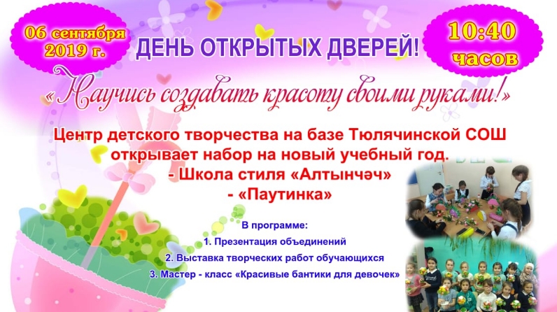6 сентябрь көнне Балалар иҗат үзәгенең өстәмә белем бирү педагогы Галимзянова Фания Габделхак кызы Теләче урта мәктәбе базасында, укучылар һәм ата-аналар өчен “Ачык ишекләр көне” уздырды.