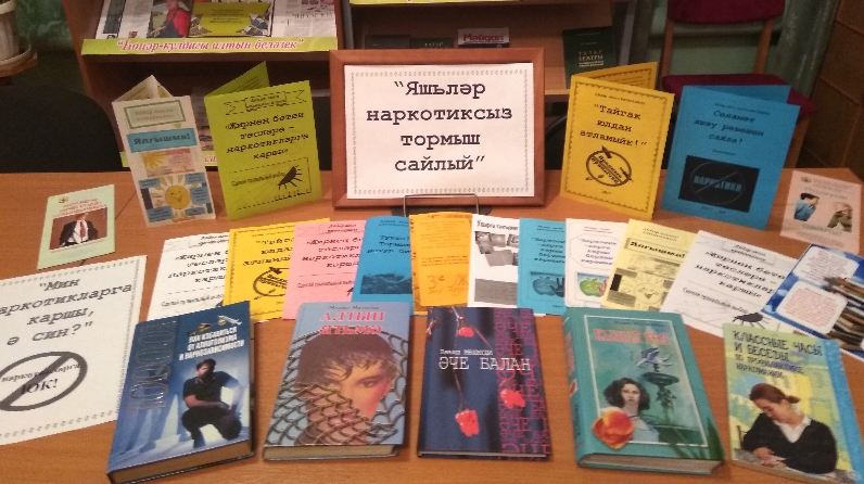 Күргәзмәдә наркомания проблемасына багышланган китаплар, брошюралар, журналлардан мәкаләләр, зарарлы гадәтләрне кисәтү буенча төзелгән басмалар урын алды. Биредә яшьләрнең наркотик матдәләр куллануының төп сәбәпләре белән танышырга, танышлары яки дуслары наркотикларга тартылганда үзеңне ничек тотарга һәм ярдәм сорап кая мөрәҗәгать итәргә икәнлеген белергә була.