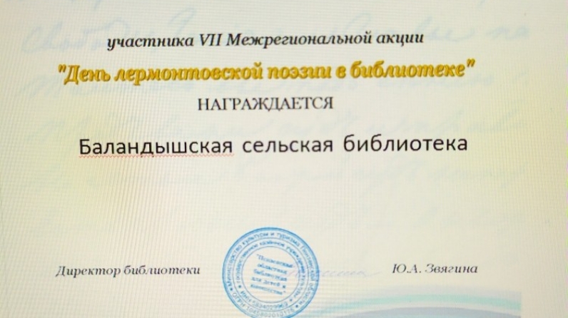 14 октябрь көнне Баландыш авыл китапханәсе " Китапханәдә Лермонтов шигърияте көне» акциясендә катнашты. Баландыш төп гомуми белем бирү мәктәбе укучылары белән уздырылган әдәби сәгать "Лермонтов дөньясы " - дип аталды. Михаил Юрьевич Лермонтовның кыска, әмма якты тормышы Россия әдәбиятында тирән эз калдырган. Укучылар «Җилкән», «Яз», «Листок», «Бородино», «Дары Терека», «Утес» һ.б. шигырьләрен укыдылар. Чара шагыйрьнең тормышы һәм иҗаты турында электрон презентация белән үрелеп барды.