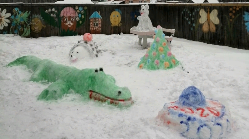 Быел да искәрмә түгел. Бәйрәм алды кәефен тагын да күтәреп, күңелләрдә матурлык һәм хозурлык уятып балалар бакчасы территориясендә кардан ясалган фигуралар, әкият персонажлары барлыкка килә. Бу эш бергәләп, күмәкләшеп башкарыла. Кар сыннары балалар бакчасына керү юлын бизәп тора.