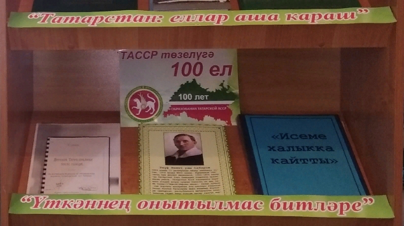 ТАССР төзелү – ул республикабызның дәүләтчелеге үсеше тарихында иң мөһим чор. Бу вакыйга уңаеннан, Айдар авыл китапханәсендә Татар Автоном Совет Социалистик Республи-касы төзелү тарихы, аның үсеше, мирасы белән бәйле «Яшә, Татарстан, даның еракларга тара-лып!” дип исемләнгән күргәзмә оештырылды. Анда тәкъдим ителгән басмалар укучыларны татар мәдәнияте, республика үсешенә үзләреннән бәяләп бетергесез зур өлеш керткән танылган шәһесләр иҗаты белән таныштыра.