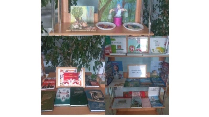 Китапханәче Хазипова Ф. А. Хәтер һәм Дан елына, ТАССРның 100 еллыгына багышланган һәм кул эшләнмәләреннән күргәзмә оештырды.