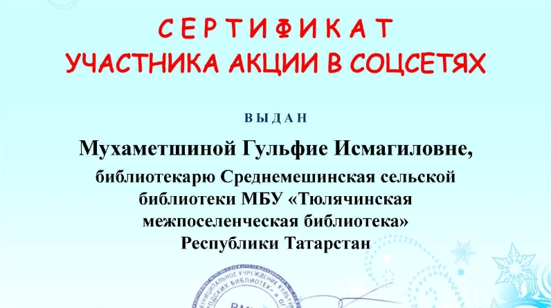 Урта Мишә авыл китапханәсе "Китап өчен яңа ел" исемле китапханә акциясенә кушылып, Сертификат белән бүләкләнде.