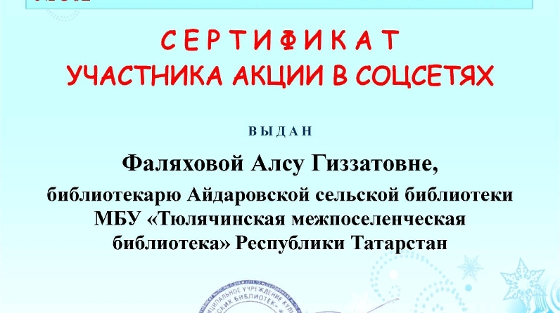 Айдар авылы китапханәсе Волгоград муниципаль мәдәният учреждениесенең үзәк китапханәсе оештырган "Китапларга Яңа ел" дип исемләнгән китапханә акциясендә катнашып сертификатка ия булды.