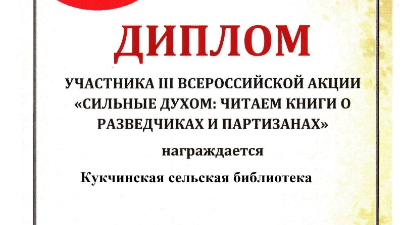 2 нче февраль көнне Күкчә авыл китапханәсе  Свердлау өлкәсе Талицк район китапханәсе үткәргән «Көчле рухлылар: партизаннар һәм разведчиклар турында китап укыйбыз» акциясенә кушылды һәм диплом  белән бүләкләнде.