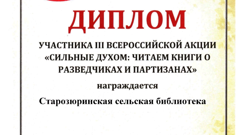2 нче февраль көнне Иске Җөри авылы китапханәсе  Свердлау өлкәсе Талицк район китапханәсе үткәргән «Көчле рухлылар: партизаннар һәм разведчиклар турында китап укыйбыз» акциясенә кушылды һәм диплом  белән бүләкләнде.